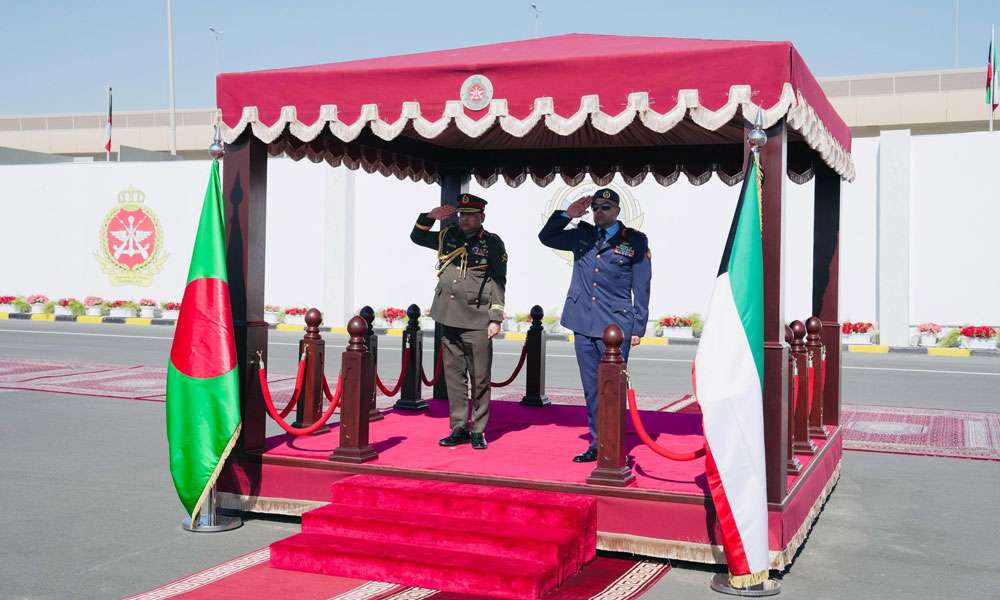 بحث نائب رئيس الأركان العامة للجيش الكويتي اللواء الركن طيار صباح جابر الأحمد الصباح مع رئيس الأركان لجمهورية بنغلاديش الشعبية الصديقة الفريق أول واكر الزمان موضوعات عسكرية مشتركة.