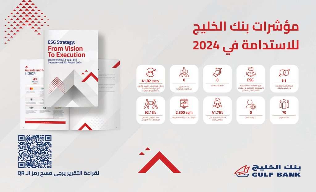 أصدر بنك الخليج التقرير السنوي الخامس للاستدامة عن عام 2024، تحت عنوان ” من الرؤية إلى التنفيذ”، ليعكس مدى التقدم الذي حققه البنك في مجالات الاستدامة، بما يتماشى مع رؤية الكويت الجديدة 2035، وبما يتوافق مع المبادرة العالمية لإعداد التقارير (GRI)، ومعايير مؤشر MSCI للاستدامة وأهداف الأمم المتحدة للتنمية المستدامة (SDGs) وكذلك الدليل الإرشادي لإفصاحات الاستدامة الصادرة عن بورصة الكويت.