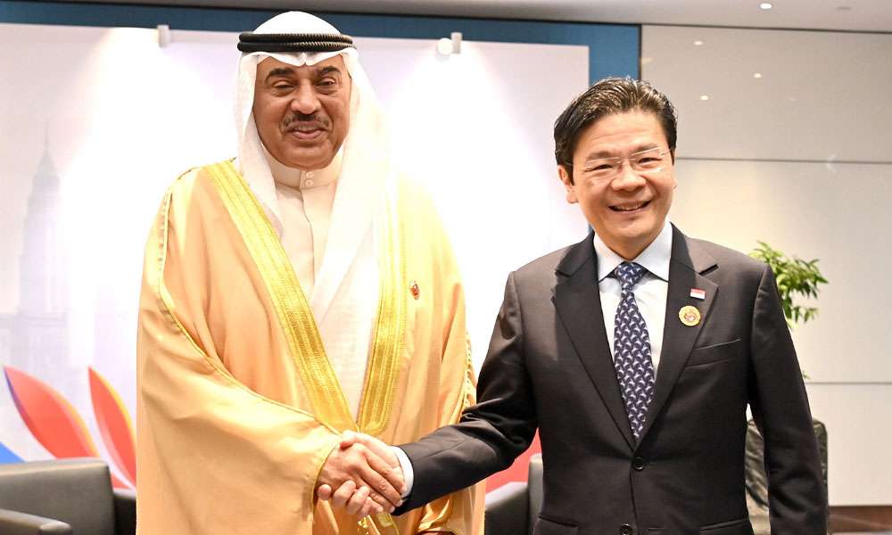 التقى ممثل حضرة صاحب السمو أمير البلاد الشيخ مشعل الأحمد الجابر الصباح حفظه الله ورعاه سمو ولي العهد الشيخ صباح خالد الحمد الصباح حفظه الله معالي رئيس الوزراء ووزير المالية في جمهورية سنغافورة الصديقة لورنس وونج على هامش القمتين الثانية لدول الآسيان ودول مجلس التعاون لدول الخليج العربية ودول الآسيان ودول مجلس التعاون لدول الخليج العربية وجمهورية الصين الشعبية.