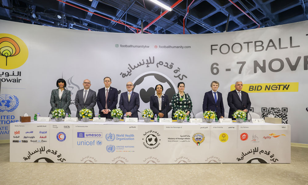 توظيفاً للشعبية العالمية لكرة القدم في خدمة الدبلوماسية الإنسانية وتقديم الدعم الملموس للأطفال المتأثرين بالأزمات، عقدت اليوم مبادرة «كرة القدم للإنسانية» مؤتمراً صحفياً في مركز الحمراء للتسوق للإعلان رسمياً عن انطلاق برنامج النسخة الأولى من دولة الكويت تحت رعاية معالي السيد عبدالله علي اليحيا، وزير الخارجية، وبالشراكة مع الأمم المتحدة ممثلةً باليونسكو ومنظمة الصحة العالمية واليونيسيف ومكتب المنسق المقيم للأمم المتحدة في الكويت، ومشاركة سفارات تسع دول، والقطاع الخاص الكويتي، حيث سيتم توجيه ريع بطولة كرة قدم مخصصة للصغار، ومزاد خيري لمقتنيات كروية حصرية، وأنشطة مجتمعية متنوعة، لتقديم الدعم الحيوي للأطفال الفلسطينيين، على أن يدار الريع حصراً عن طريق جمعية الهلال الأحمر الكويتي.