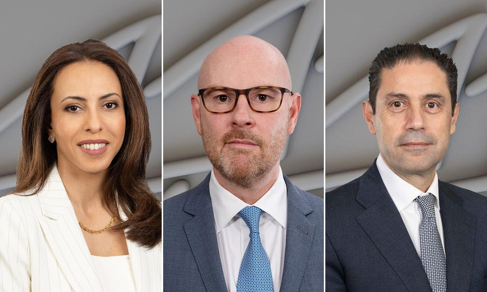 الرئيس التنفيذي بالوكالة لبنك الخليج سامي محفوظ ورئيس المدراء الماليين في بنك الخليج ديفيد تشالينور ورئيسة علاقات المستثمرين في بنك الخليج دلال الدوسري
