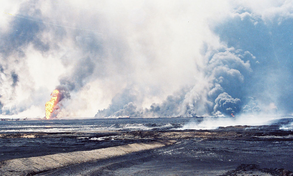 وصاحب اشتعال الآبار انتشار كميات هائلة من الدخان والنيران في كل الاتجاهات وتفجير مراكز تجميع النفط التي تصل بين الآبار وموانئ التصدير لتزداد المنطقة اشتعالا ودمارا.