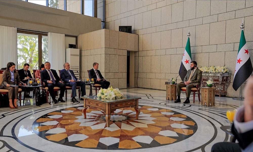 والتقى الوفد الرئيس السوري أحمد الشرع وعددا من المسؤولين السوريين في قصر الشعب، بعد جولة صباحية شملت زيارة حي جوبر، أحد أكبر الأحياء المدمرة قرب دمشق، وزيارة خاطفة للمدينة القديمة والجامع الأموي.