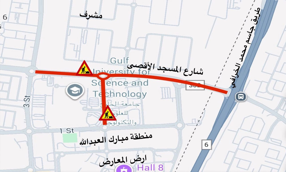 أعلنت الإدارة العامة للمرور عن إغلاق شارع المسجد الأقصى (مشرف ومنطقة مبارك العبدالله) بالإتجاهين اعتباراً من دوار المطافي حتى دوار الجامعة الأمريكية بالإضافة إلى دوار الجامعة الأسترالية حتى دوار التأمينات إعتباراً من يوم الخميس 4 ديسمبر وحتى يوم السبت 7 ديسمبر 2025.