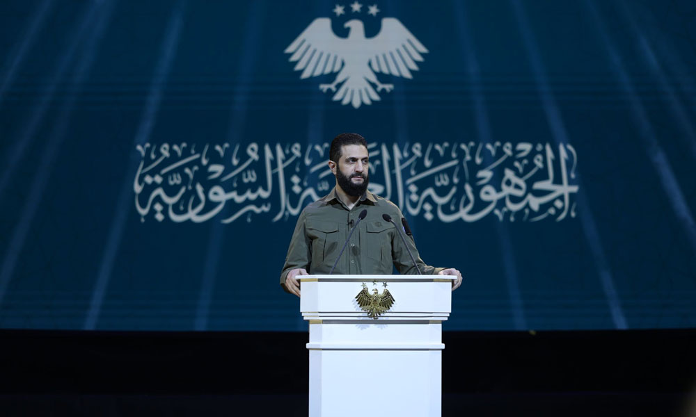 في كلمة ألقاها في قصر المؤتمرات في دمشق، قال الشرع “اليوم ومع إشراق شمس الحرية، فإننا نعلن عن قطيعة تاريخية مع ذاك الموروث وهدما كاملا لوهم الباطل ومفارقة دائمة لحقبة الاستبداد والطغيان إلى فجر جديد، فجر قوامه العدل والإحسان والمواطنة والعيش المشترك”.