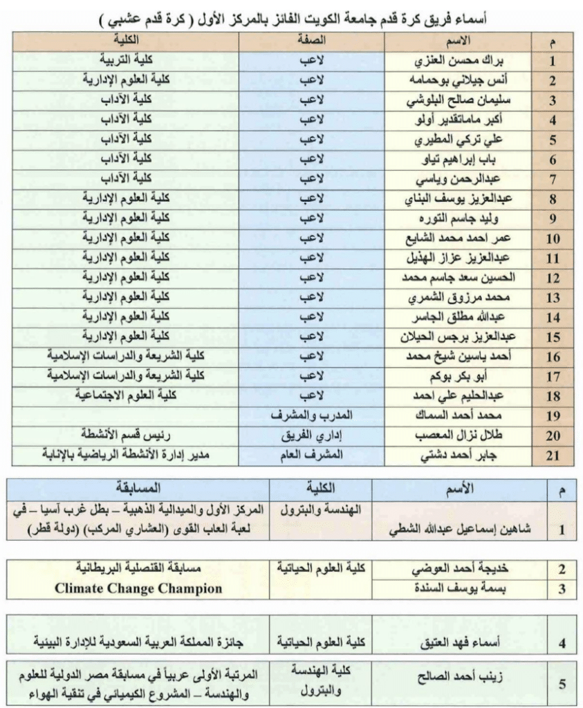 وجدير بالذكر أن المسابقات التي حصل عليها الطلبة هي كتالي: المركز الأول والميدالية الذهبية -بطل غرب آسيا- في لعبة ألعاب القوى (العشاري المركب) (دولة قطر) من كلية الهندسة والبترول حصل عليها الطالب شاهين إسماعيل عبدالله الشطي، ومسابقة القنصلية البريطانية حصلت عليها الطالبتان بسمة يوسف السندة وخديجة أحمد العوضي من كلية العلوم الحياتية، وجائزة المملكة العربية السعودية للإدارة البيئية الطالبة أسماء فهد العتيق من كلية العلوم الحياتية، والمرتبة الأولى عربياً في مسابقة مصر الدولية للعلوم والهندسة بالمشروع الكيميائي في تنقية الهواء الطالبة زينب أحمد الصالح من كلية الهندسة والبترول.