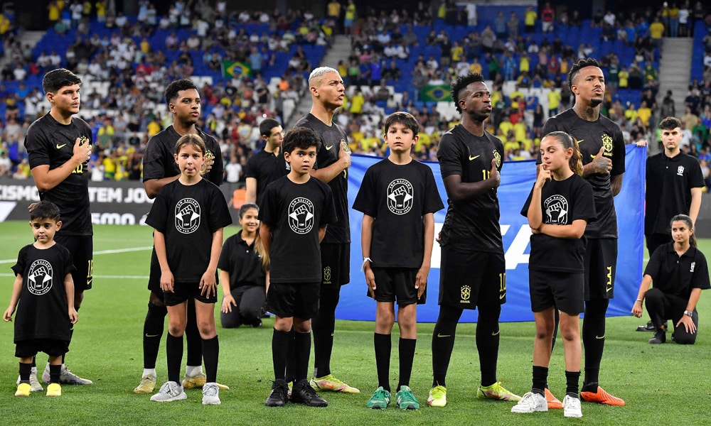 وسيواجه أبطال العالم خمس مرات غينيا ودياً في برشلونة السبت، على أن يرتدي زملاء مهاجم ريال مدريد الإسباني فينيسيوس جونيور الذي عُيّن من قبل رئيس الاتحاد الدولي لكرة القدم “فيفا” السويسري-الإيطالي جاني إنفانتينو لرئاسة لجنة خاصة لمحاربة العنصرية، قمصاناً سوداء بدلاً من الصفراء المعتادة.