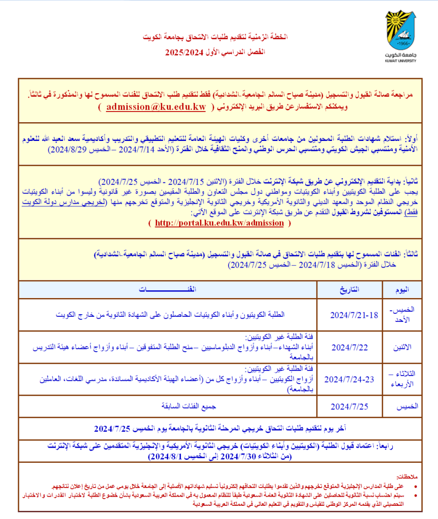 كما ذكر أن عملية تقديم طلبات الالتحاق بالجامعة للفصل الدراسي الأول 2025/2024 ستكون باستخدام شبكة الإنترنت من خلال صفحة نظام القبول الإلكتروني على العنوان التالي: http://portal.ku.edu.kw/admission، حيث يمكن للطلبة المذكورين سلفاً تقديم طلب الالتحاق بالجامعة من خلال هذا الموقع. علماً أن فترة اعتماد القبول المعلنة بالخطة الزمنية للطلبة الكويتيين وأبناء الكويتيات هي لخريجي الثانوية الأمريكية والإنجليزية المتقدمين بطلبات التحاق على شبكة الإنترنت، ولا تشمل الطلبة خريجي النظام الموحد والمعهد الديني حيث سيتم اعتماد قبولهم إلكترونيّاً دون الحاجة لمراجعة صالة القبول والتسجيل.