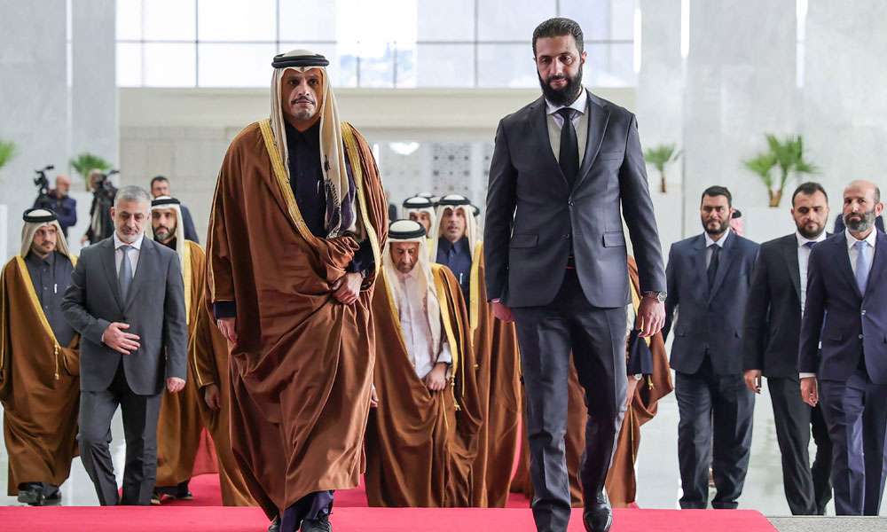 قائد الإدارة السورية الجديدة أحمد الشرع ورئيس مجلس الوزراء القطري محمّد بن عبد الرحمن آل ثاني